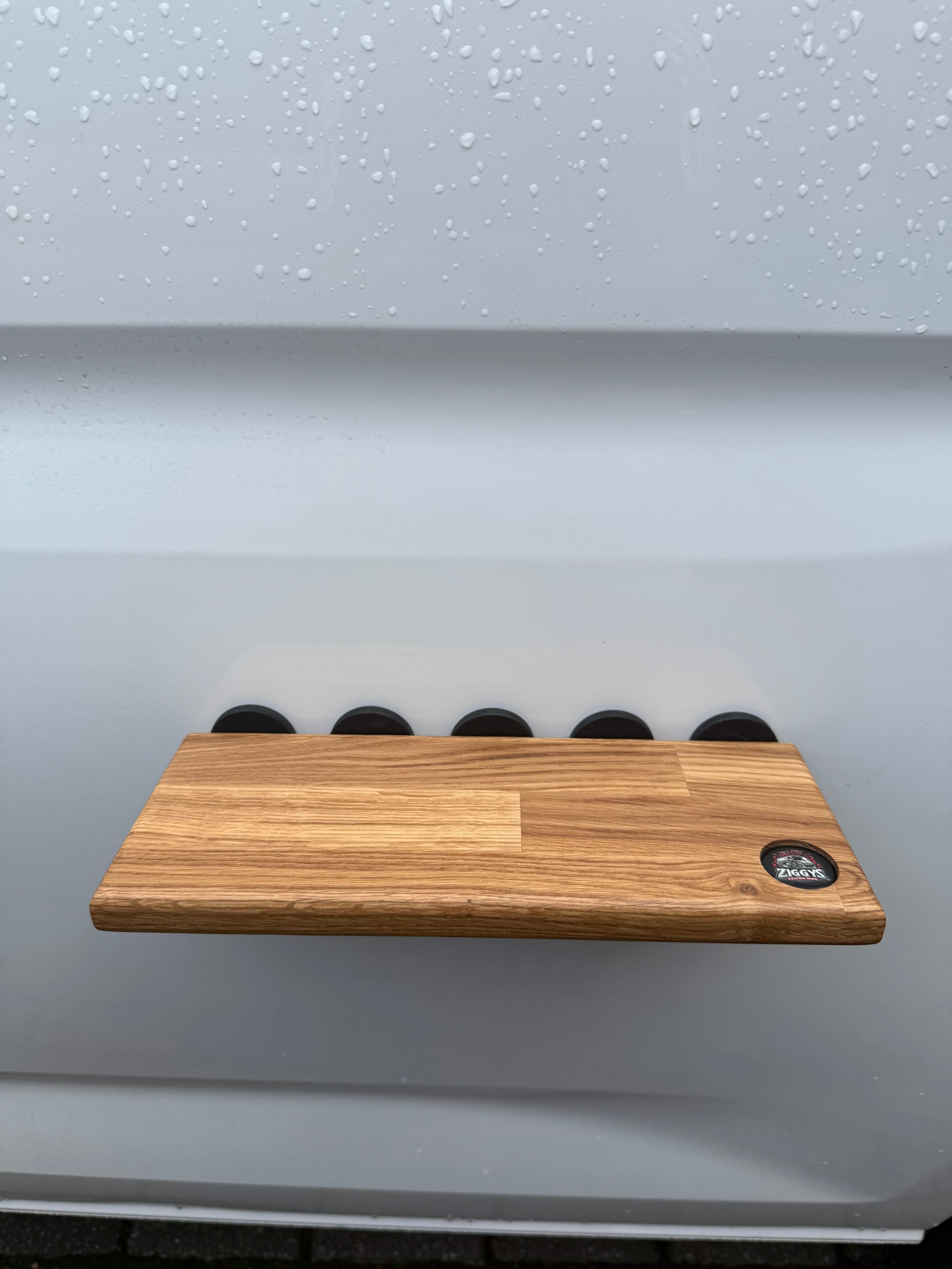 Handcrafted from solid oak, this sleek, sturdy shelf attaches effortlessly to your vehicle (or any metal surface) with 5 powerful, rubber-coated magnets ā so no scratches! š§²